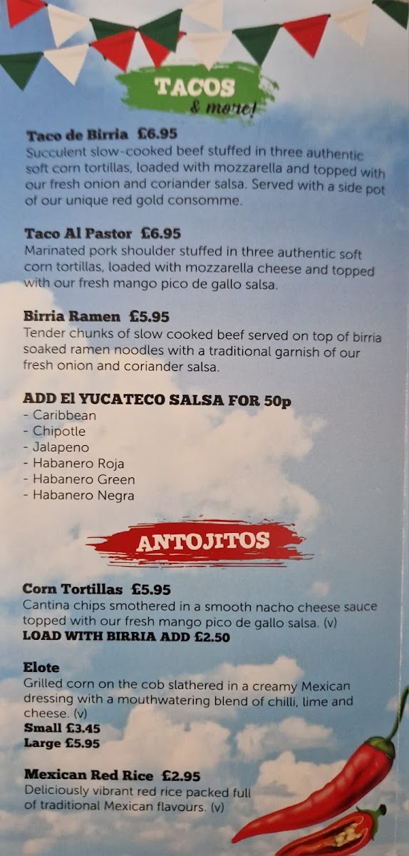 Antojitos feature Mexican-inspired small plates including Corn Tortillas, Elote (Mexican street corn), and Mexican Red Rice. These items offer flavorful, smaller portions that can be enjoyed as starters or side dishes.