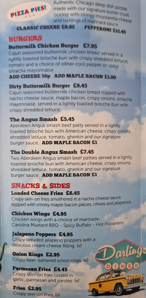 Snacks & Sides include popular options such as Loaded Cheese Fries, Chicken Wings, Jalapeno Poppers, Onion Rings, Parmesan Fries, and classic Fries. These items provide convenient accompaniments or light bites suitable for sharing or as a complement to main dishes.